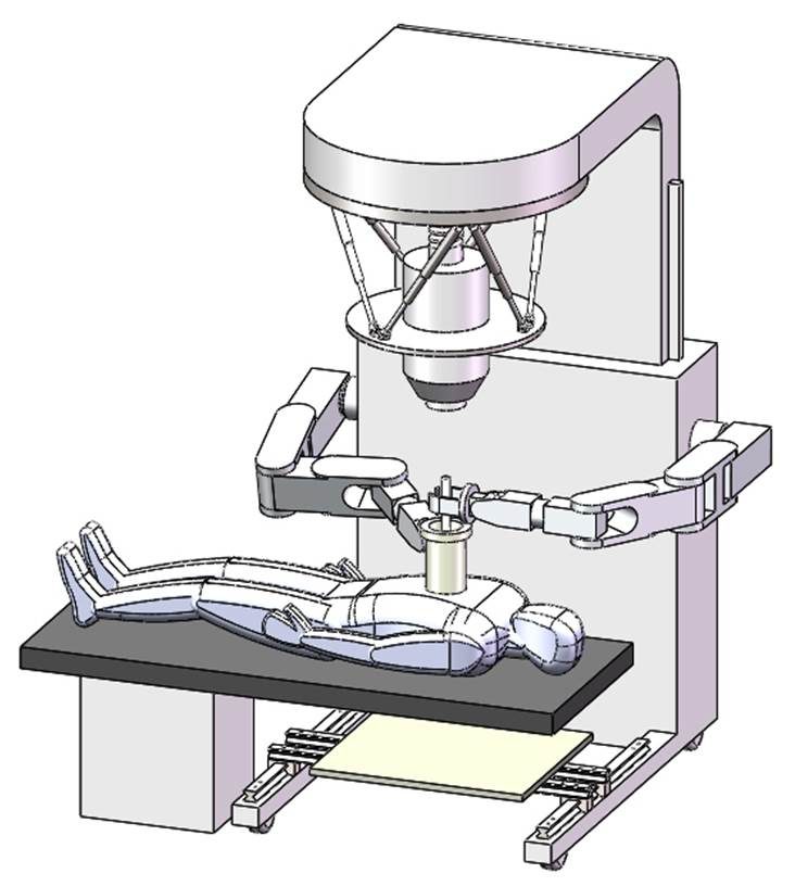 本项目已申请国家发明专利6项,实用新型1项,美国专利2项;本项目利用图像引导技术和机器人辅助引导定位技术,研制机械臂辅助图像引导术中放疗系统(即术中放疗机器人)。术中放疗机器人将针对肝癌、胰腺癌、乳腺癌、脑瘤等全身各部位肿瘤IORT而设计,具备以下主要功能:能够让医生看到肿瘤位置,量化肿瘤与正常组织相对位置,便于术前模拟手术路径;能够实时获取图像,便于监测手术进展和采取最优手术方案;能够定量评估手术结果,确保制定最优的术中精确放疗计划设计;能够精确摆放限光筒,确保术中精确放疗计划实施。最终实现IORT精准定位、精准计划和精准实施的目标,使IORT技术水平达到甚至超过外照射技术水平。产品创新:术中放疗机器人具备五项独有核心技术:1.超声图像引导定位;2.六自由度并联平台的应用;3.多轴机械臂的联合应用;4.适用于高能电子束的球囊状施照器;5.调强、调能IORT技术。系统研制成功将填补国内同类产品的空白,并领先国际同类产品至少一代。市场潜力:本系统的用户定位是收治肿瘤患者人数多的大医院。第一阶段研发的标准版系统,配置传统的限光筒和新颖的囊状施照器,可以开展两维常规放疗和图像引导放疗技术,配合挡块可开展适形放疗技术,配合bolus可开展调能放疗技术。